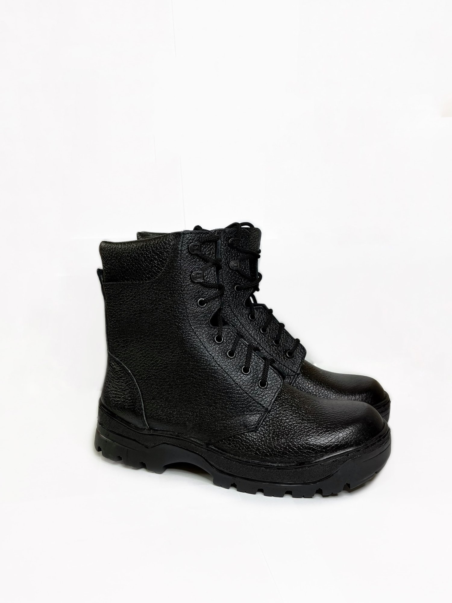Ботинки кожаные на искусственном меху - конструкция заготовки состоит из цельной союзки, высоких берец, детали мягкого канта, заднего наружного ремня и полуглухого клапана. По верху берец проходит мягкий бортик из натуральной кожи . В передней части берец имеется 5 пар блочек и 2 пары металлических крючков для шнурков. В носочной части установлен подносок из термопласта, в пяточной части - задник из термопласта. Метод крепления подошвы - клеевой.